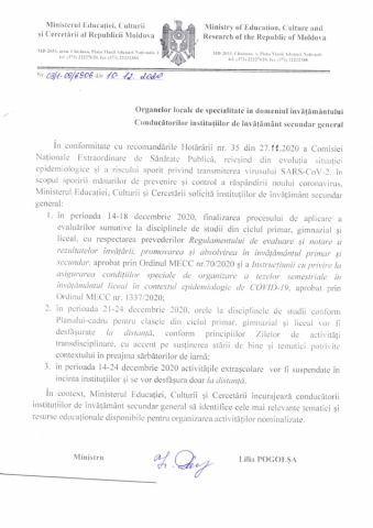 Reieșind din evoluția situației epidemiologice și a riscului sporit privind transmiterea virusului SARS-CoV-2, Ministerul Educației, Culturii și Cercetării a emis astăzi, 10 decembrie, demersul nr.03/1-09/6906 prin care solicită reprezentanților organelor locale de specialitate în domeniul învățământului și conducătorilor instituțiilor de învățământ general să asigure în perioada 14-18 decembrie, finalizarea procesului de aplicare a evaluărilor sumative la disciplinele de studii din ciclul primar, gimnazial și liceal, cu respectarea prevederilor Regulamentului de evaluare și notare a rezultatelor învățării, promovarea și absolvirea în învățământul primar și secundar și a Instrucțiunii cu privire la asigurarea condițiilor speciale de organizare a tezelor semestriale în învățământul liceal în contextul epidemiologic de COVID-19.