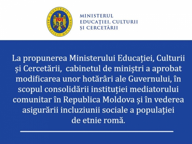 La propunerea Ministerului Educației, Culturii și Cercetării, cabinetul de miniștri a aprobat astăzi, 22 decembrie, modificarea unor hotărâri ale Guvernului, în scopul consolidării instituției mediatorului comunitar în Republica Moldova și în vederea asigurării incluziunii sociale a populației de etnie romă.