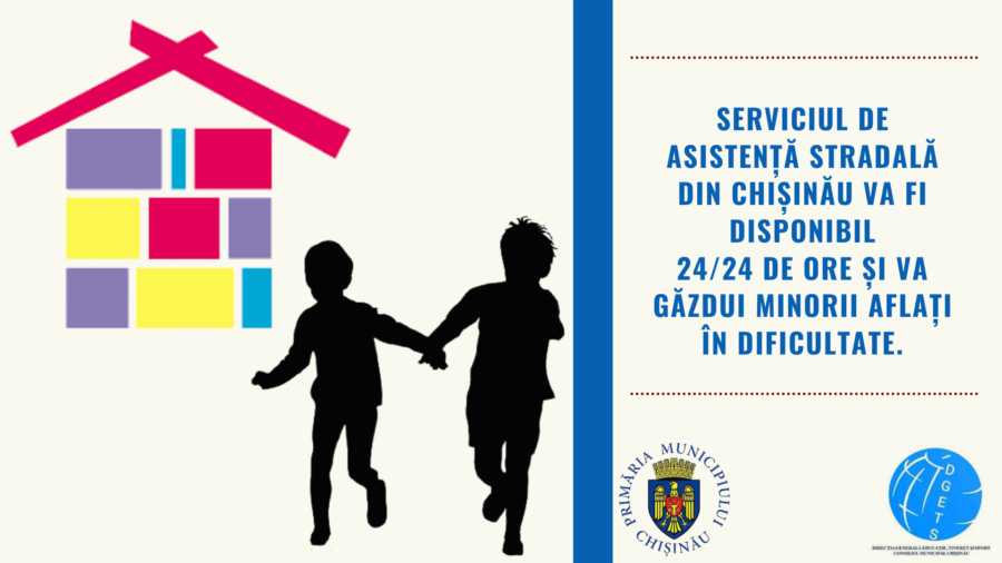 Direcția Generală Educație, Tineret și Sport a Consiliului municipal Chișinău informează că din data de 12 ianuarie 2021, Serviciul Asistență Stradală din subordinea Direcției municipale pentru protecția drepturilor copilului, amplasat pe adresa: str. Miron Costin, 19/1, care activa doar pe timp de zi, va presta servicii de plasament și pe timp de noapte. În cadrul instituției vor putea fi cazați concomitent zece copii, iar în prezent de aceste servicii beneficiază zilnic 4-6 minori.