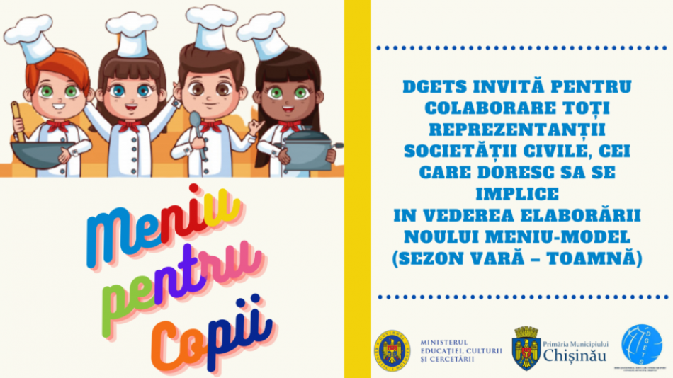 Direcția generală educație, tineret și sport a municipiului Chișinău face apel către reprezentanții societății civile, interesați de activitatea instituțiilor de învățământ preșcolar, să participe la elaborarea noului MENIU-MODEL vară-toamnă al IET din capitală.