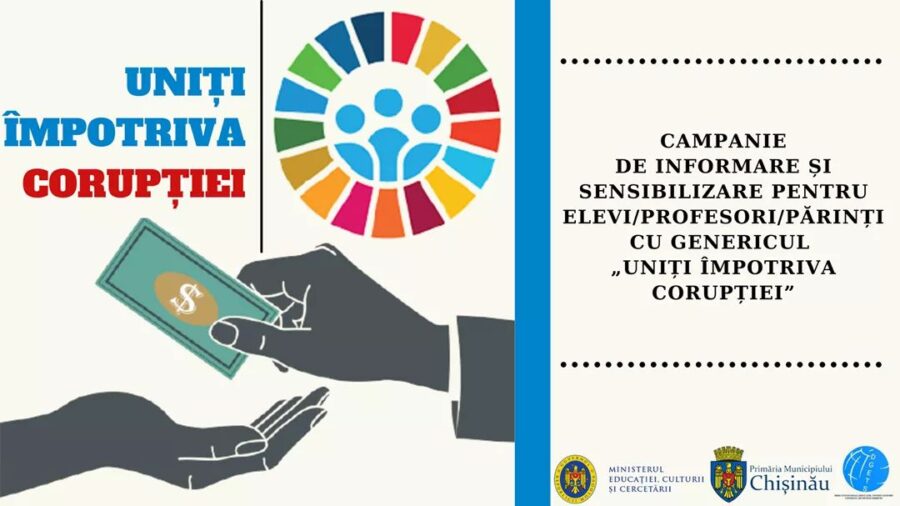 În scopul educării tinerei generaţii pentru integritate şi corectitudine prin promovarea sentimentului de responsabilitate punând bazele formării unor caractere sănătoase, încurajând o mai mare implicare a elevilor în viața socială, Direcția Generală Educație, Tineret și Sport a Consiliului municipal Chișinău lansează Campania de informare și sensibilizare pentru elevi/profesori/părinți cu genericul „Uniți împotriva corupției”.