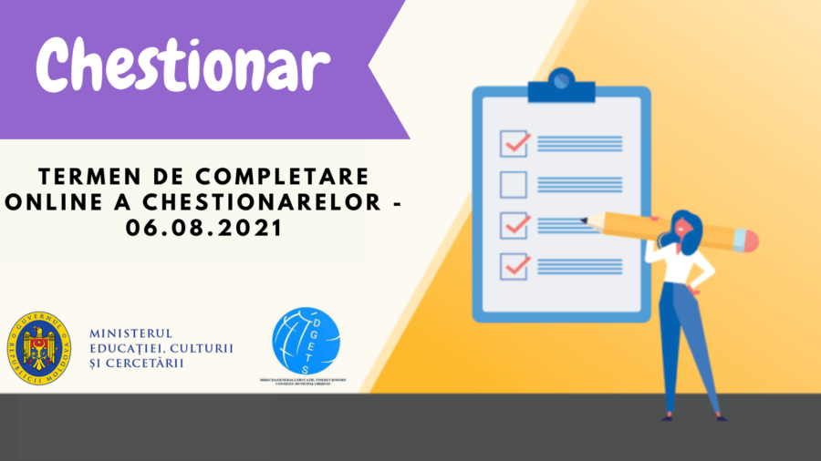 În baza ordinului Ministerului Educație, Culturii și Cercetării nr. 775 din 23.06.2021„Cu privire la desfășurarea evaluării vivacității și calității manualelor școlare în anul 2021”, în vederea asigurării accesului la o educație de calitate pentru fiecare elev, Direcția generală educație, tineret și sport a Consiliului municipal Chişinău vă informează privitor la chestionarele pentru elevi si părinți (anexele nr. 5-6 „la Metodologia de evaluare a vivacității și calității manualelor școlare”) , care pot fi accesate pe pagina MECC https://mecc.gov.md/ro/content/chestionar-manuale