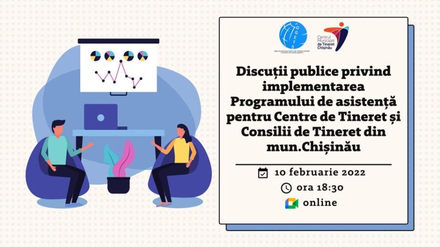 Centrul Municipal de Tineret Chișinău a Direcției generale educație, tineret și sport invită tinerii interesați la o discuție privind implementarea Programului de asistență pentru Centre de Tineret și Consilii de Tineret din municipiul Chișinău.