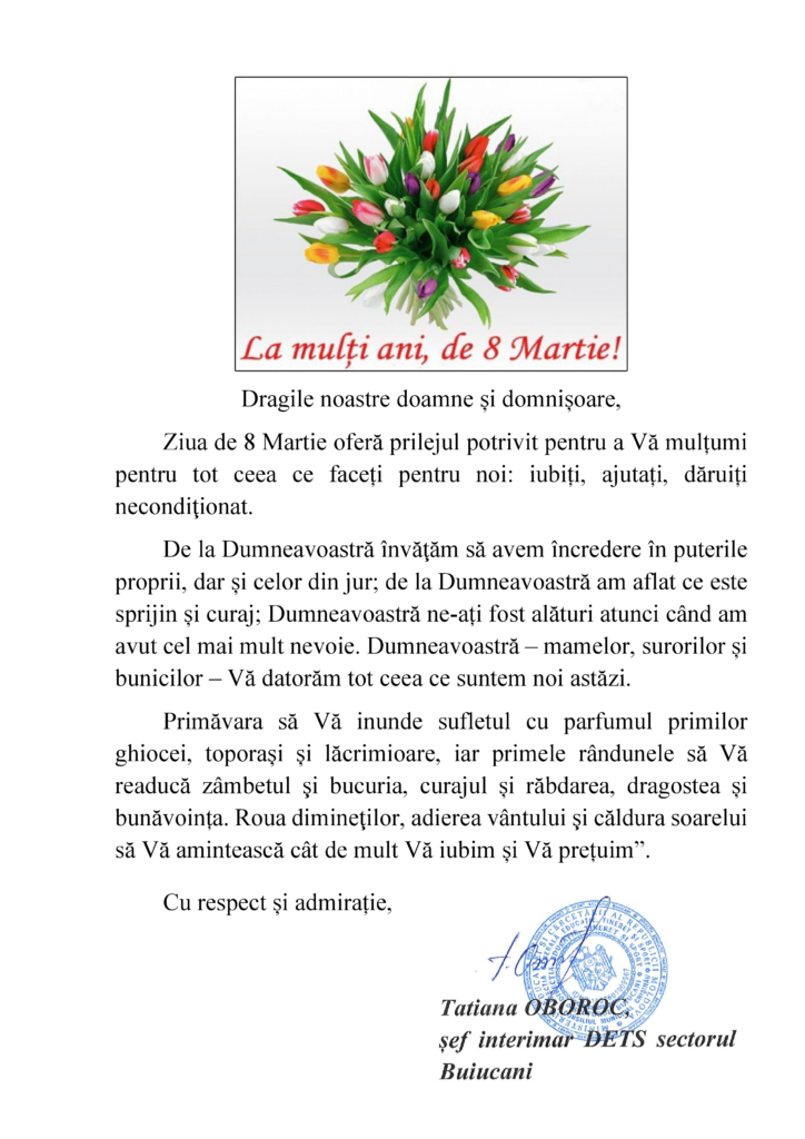Ziua de 8 Martie oferă prilejul potrivit pentru a Vă mulțumi pentru tot ceea ce faceți pentru noi: iubiți, ajutați, dăruiți necondiţionat.
