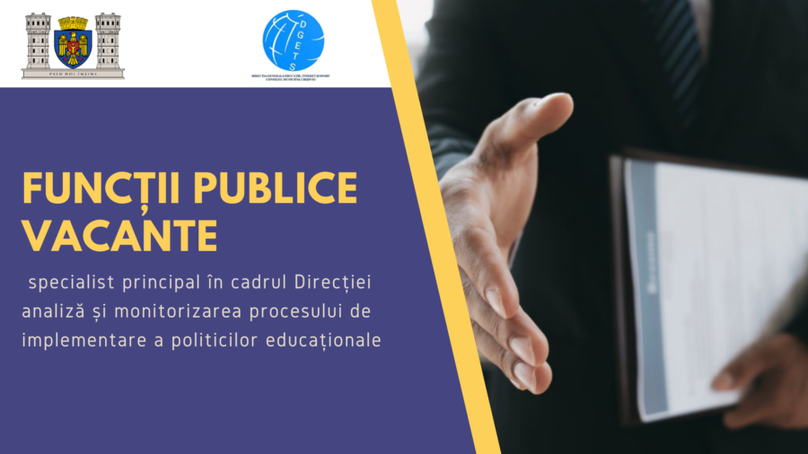 În conformitate cu prevederile Regulamentului cu privire la ocuparea funcției publice vacante prin concurs, aprobat prin Hotărârea Guvernului Republicii Moldova nr. 201 din 11 martie 2009, Direcția Generală Educație, Tineret și Sport anunță concurs pentru ocuparea funcției publice vacante de  specialist principal în cadrul Direcției  analiză și monitorizarea procesului de implementare a politicilor educaționale