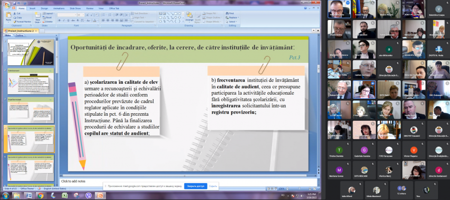 Ministrul Educației și Cercetării Anatolie Topală a convocat astăzi, 16 martie, în ședința operativă șefii și reprezentații Organelor locale de specialitate în domeniul învățământului (OLSDÎ). În cadrul acestei ședințe a fost discutată Instrucțiunea privind încadrarea în instituțiile de învățământ general din Republica Moldova a copiilor din familii refugiate din Ucraina, elaborată și aprobată de MEC.