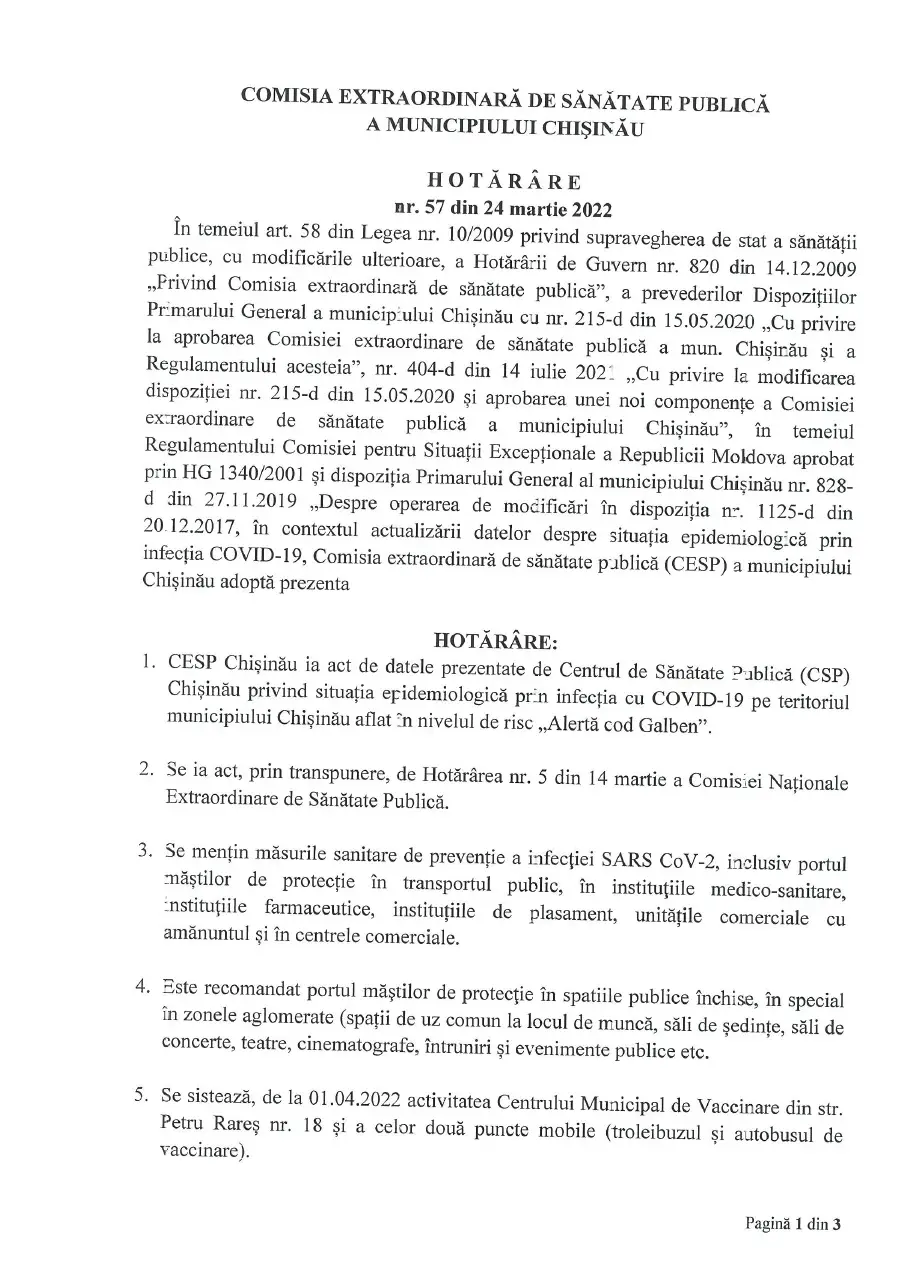 Important! Hotărârea nr. 57 din 24.03.2022 a Comisiei Extraordinare de Sănătate Publică