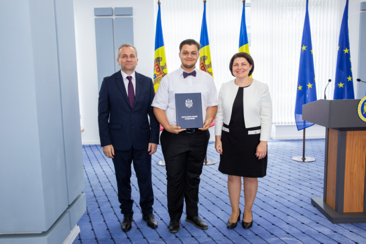 Prim-ministra Natalia Gavrilița și ministrul Educației și Cercetării Anatolie Topală au participat la evenimentul de acordare a Diplomelor de merit pentru elevii cu media 10 la examenul național de bacalaureat, organizat astăzi, 5 iulie 2022, în sediul Guvernului Republicii Moldova.