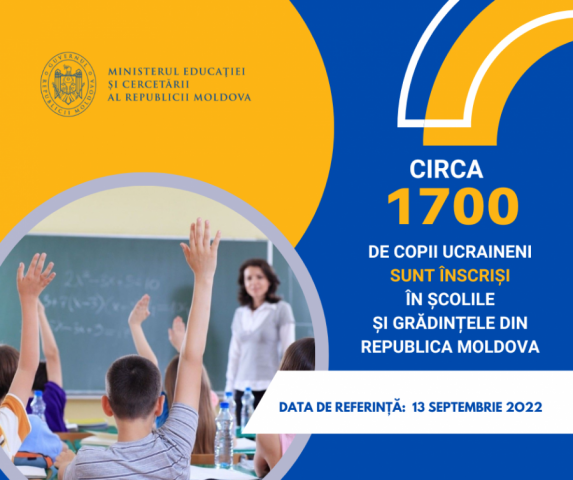 Datele centralizate de Ministerul Educației și Cercetării, comunicate de Organele locale de specialitate în domeniul învățământului (OLSDÎ), arată că, la data de 13 septembrie 2022, 1676 de copii refugiați din Ucraina au fost înscriși în anul de studii 2022-2023 în școlile și grădiniţele din Republica Moldova, dintre care 1155 de elevi și 521 de preșcolari.