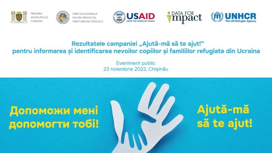 Primăria municipiului Chișinău și Direcția Generală pentru Protecția Drepturilor Copilului a Consiliului municipal Chișinău au prezentat în cadrul unui eveniment public, la Centrul municipal de plasament temporar al refugiaților „Patria Lukoil”, rezultatele campaniei „Ajută-mă să te ajut!”, care a fost implementată în perioada 30 mai – 29 august curent, în cadrul proiectului „Date pentru Impact” (D4I), implementat de Palladium International, cu sprijinul financiar al Agenției SUA pentru Dezvoltare Internațională (USAID) și susținerea Agenției ONU pentru Refugiați (UNHCR).