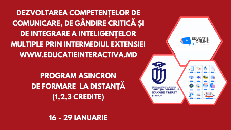 Întrucât programul de dezvoltare profesională desfășurat în perioada 2-6 ianuarie s-a bucurat de foarte mult succes, am decis să mai organizăm o rundă în perioada 16 – 29 ianuarie. Ca rezultat al participării în program, cadrele didactice interesate ar putea primi 1, 2 și 3 credite în mod corespunzător, după cum urmează: