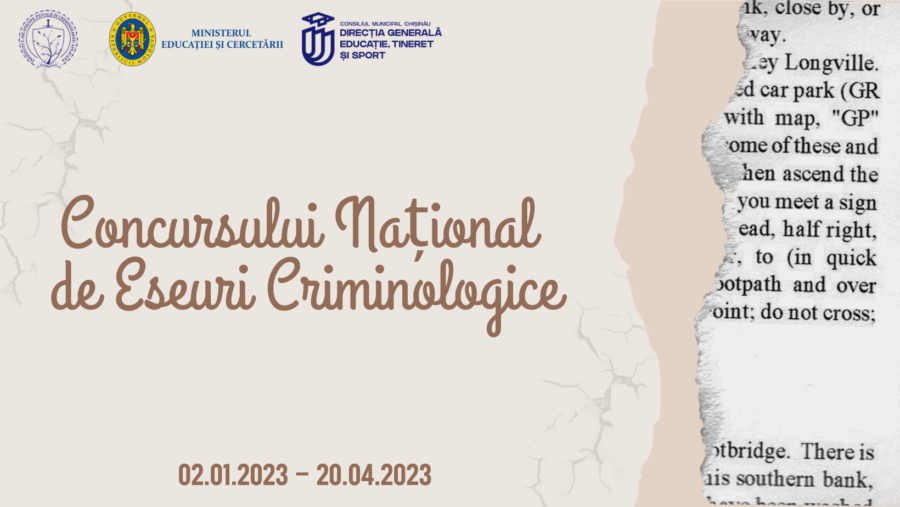 Direcția Generală Educație, Tineret și Sport a Consiliului municipal Chișinău informează că în perioada 02.01.2023 – 20.04.2023, Institutul de Științe Penale și Criminologie Aplicată, sub patronatul Ministerului Educației și Cercetării, va desfășura a X-a ediție a Concursului Național de Eseuri Criminologice cu genericul “Tineretul pentru un viitor prosper, fără crime, corupție și violență”.