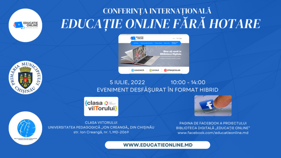 Cadrele didactice din învățământul general sunt invitate sa vizioneze webinarele Conferinței internaționale “Educație online fără hotare” plasate cu acces deschis, gratuit, pe pagina oficială de Facebook www.facebook.com/educatieonline.md Lista...