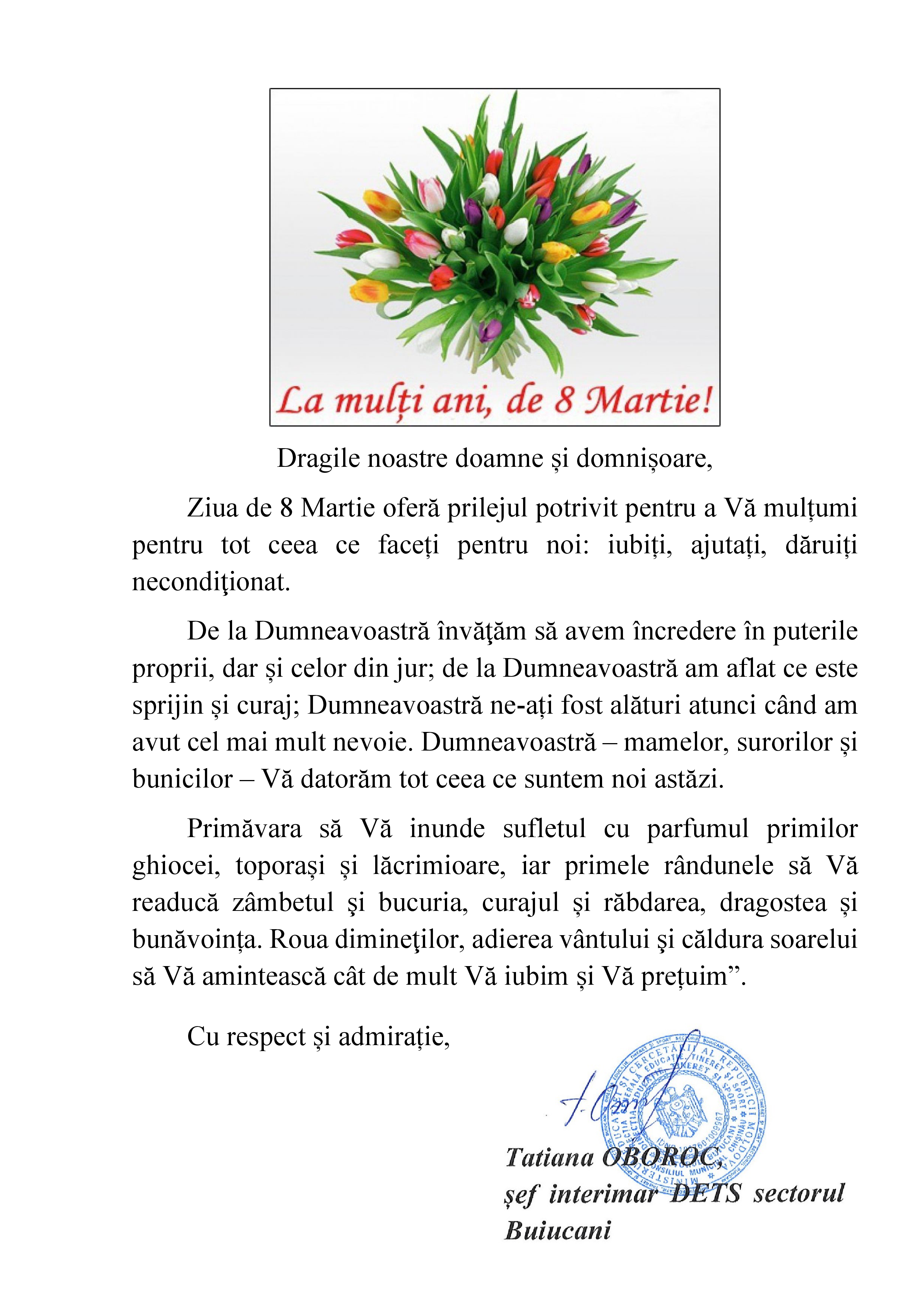 ?Dragile noastre Doamne și Domnișoare, mult stimate colege! ?Cu prilejul acestei frumoase sărbători – Ziua internațională a Femeii – Vă felicităm din tot sufletul și Vă mulțumim...