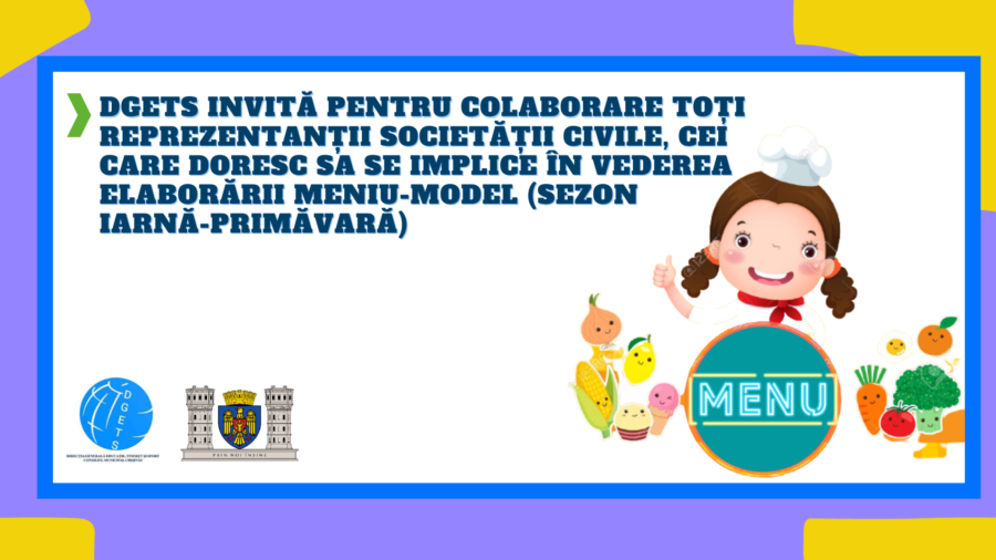 Direcția Generală Educație, Tineret și Sport a Consiliului municipal Chișinău informează că s-a dat startul elaborării proiectului MENIU-MODEL (sezon iarnă-primăvară). Meniul model se întocmește de 2 ori pe...