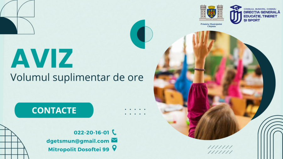 Direcția managementul resurselor umane a Direcției Generale Educație, Tineret și Sport solicită prezentarea, până la 15 februarie 2023, a demersului privind volumul suplimentar de ore pentru completarea...