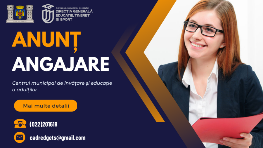 Direcția generală educație, tineret și sport a Consiliului municipal Chișinău anunță recrutarea pentru angajarea a 8 unități de personal în cadrul Centrului municipal de învățare și educație...