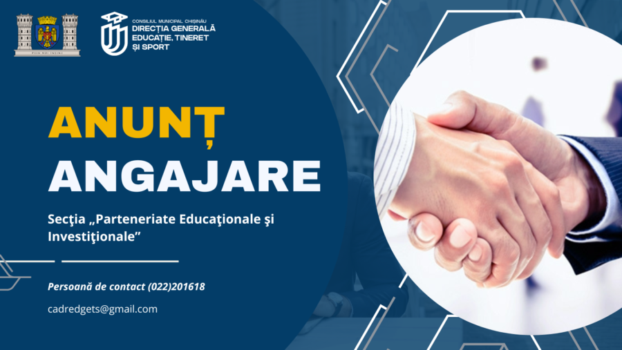 Direcția generală educație, tineret și sport a Consiliului municipal Chișinău anunță recrutarea pentru angajarea a 2 unități de personal în cadrul Secției „Parteneriate Educaționale și Investiționale”: Denumirea...