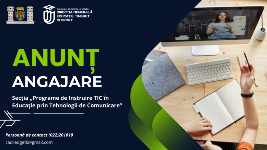 Direcția Generală Educație, Tineret și Sport a Consiliului municipal Chișinău anunță recrutarea pentru angajarea a 2 unități de personal în cadrul Secției „Programe de Instruire TIC în...